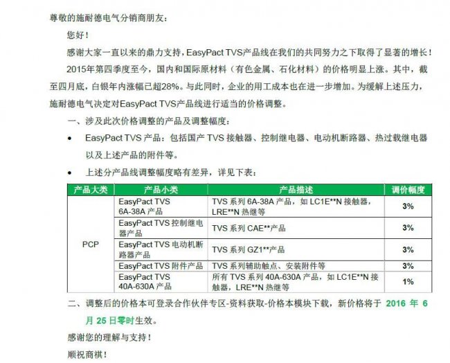 施耐德2016年漲價通知